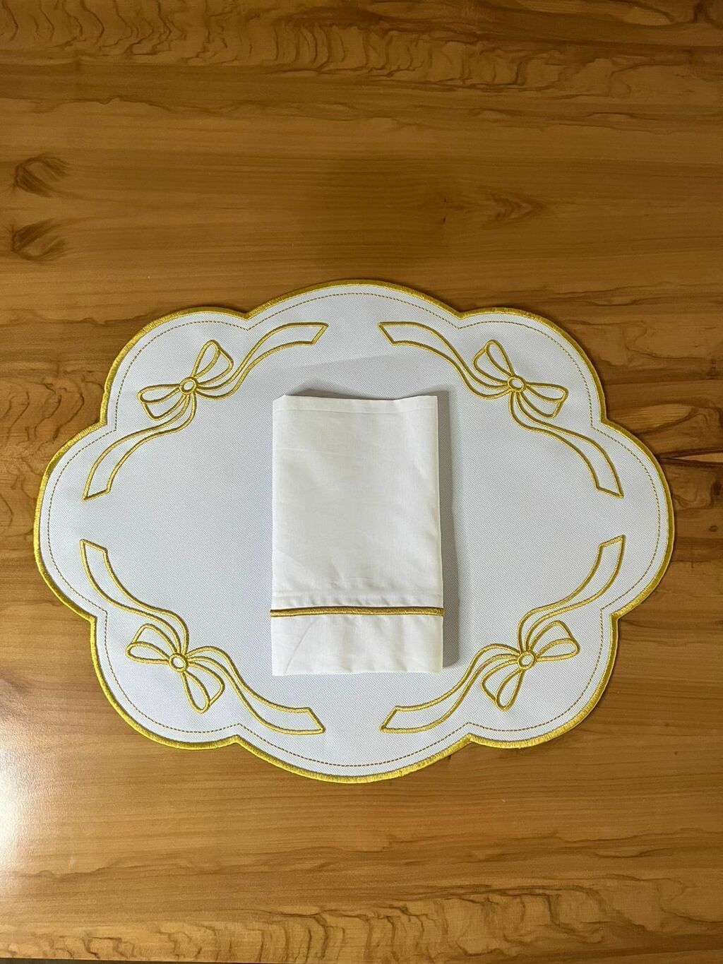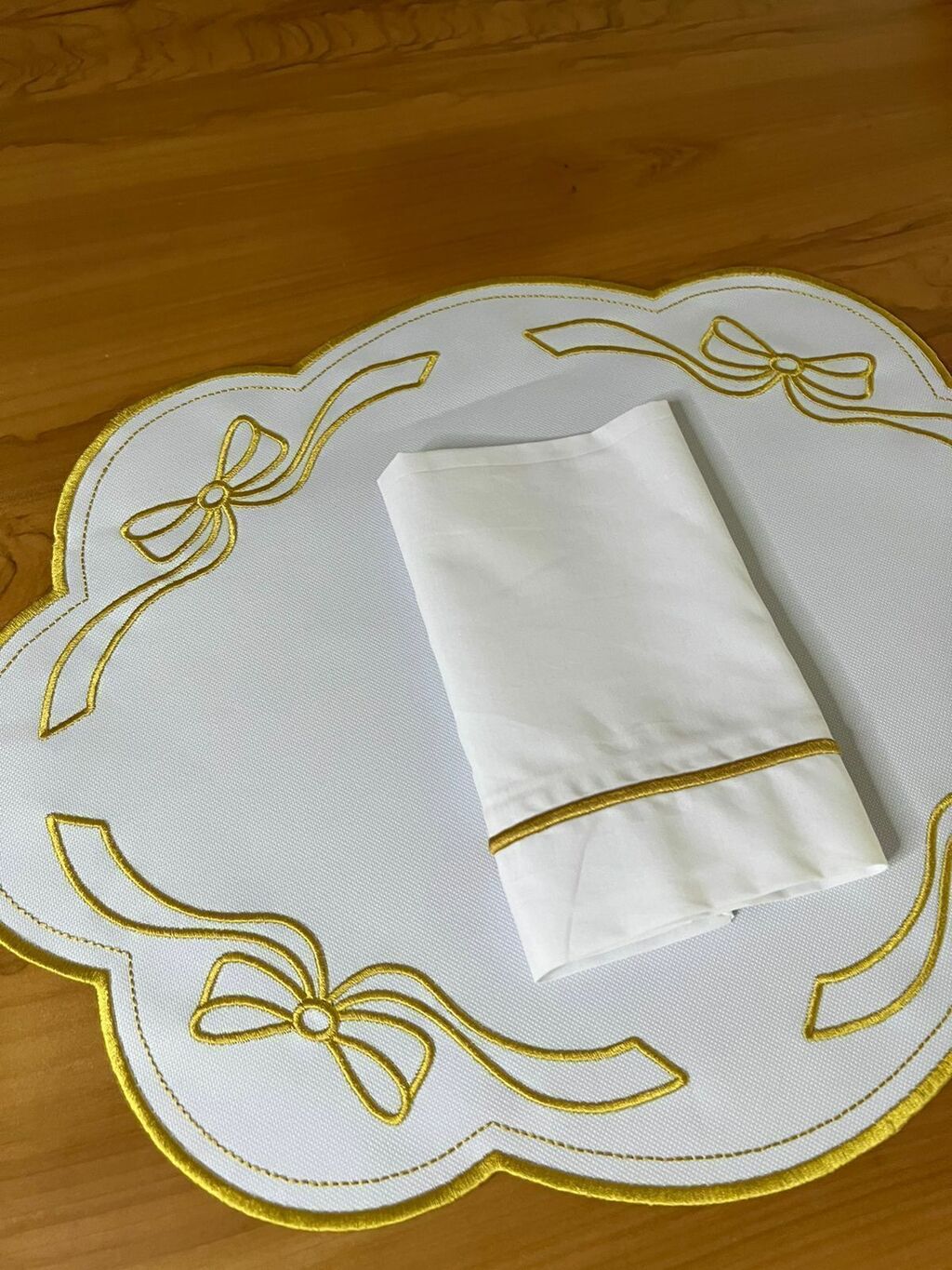 O Conjunto Americano Lasso de tecido impermeável vem trazendo muita elegacia e delicadeza para a sua mesa, os bordados do guardanapo e os detalhes do jogo americano é perfeito para jantares sofisticados em uma bela mesa posta, é encantador o seu design em tons de branco e dourado.
